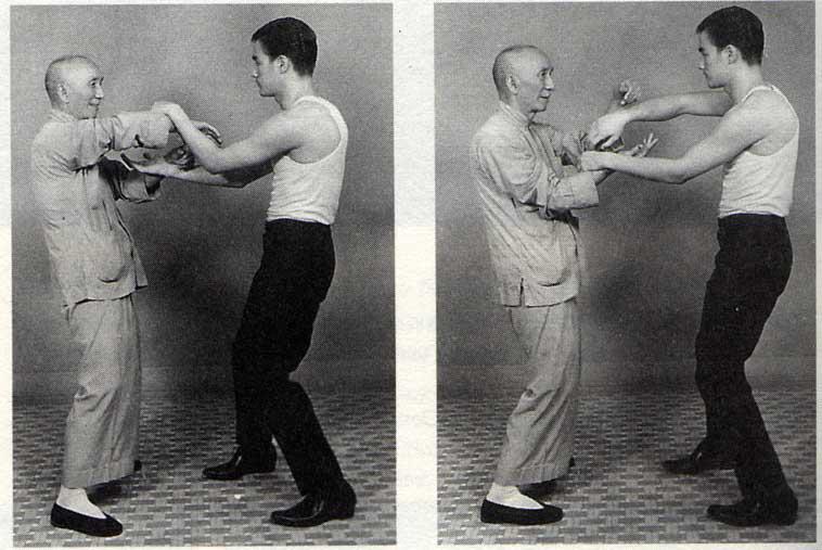 Bruce and I grew up together. We were friends since we were young boys. It was I who introduced Bruce Lee to Wing Chun School in the summer of 1954. In the old days, the master would never teach the new students. It was up to the senior students to pass on the Wing Chun lessons to Bruce. As I was his Kung Fu Senior of many years, I was instructed by Grandmaster Yip man to train him. By 1995, one year into his Wing Chun training, Bruce progressed very fast, and already became a threat to most of the Wing Chun seniors as the majority of them were armchair martial artists. They discovered that Bruce was not a full blooded Chinese because his mother was half German and half Chinese. The seniors got together and put pressure on Professor Yip Man and tried to get Bruce kicked out of the Wing Chun School. Because racism was widely practised in Martial Arts School in Hong Kong, the art was not allowed to be taught to foreigners. Professor Yip Man had no other choice but to bow to their pressure, but he told Bruce that he could train with me and Sihing Wong Shun Leung. But most of the time we trained together. The first thing I showed Bruce was the Principles of being a good fighter: 1. The Heart 2. The Eyes Extract from taped Bruce Lee conversation with Danny Lee (one of his students) in 1972: Danny: Have you thought of Tai Chi as a form of self defence? Bruce: Well, if you were there ......... you would be so embarrassed, so it is not even a free brawl .......where a man who is capable of using his tools and who is very determined to be a savage legless attack whereas those SOBs are cowards. Turning their heads and swinging punches and after the second round they are out of breath. I mean they are really pathetic looking - very amateurish. I mean even a boxer because a boxer when they concentrate on two hands, regardless of how amateurish they are, they do their thing, whereas those guys haven't decided what the hell they are going to use. I mean before they contact each other they do all the fancy stances and all the fancy movements, but the minute they contact they don't know what the hell to do. I mean that's it. They fall on their arses and they .. and hold and grapple. I think the whole Hong Kong - they call it Gong Sao- Challenge Match in Hong Kong - can you imagine that, I mean even those guys see it that way. What do you think of the appreciation of people here? So what I'm hoping to do in film is raise the level." 3. Balance Furthermore Bruce was very innovative. Back in the 50's, the Chinese Martial Artists were very conservative. They believed that weight training would slow down the practitioner's speed. But Bruce found a way to beat it. He would start his program with heavy weights and low repetitions first, then he reduced the weights and increased the repetitions. He continued to do that until his repetitions reached maximum and the speed of the exercise also increased. In this way he built muscles and developed power without losing speed. One of the most important discoveries from his Wing Chun training was that Wing Chun teaches the practitioner to train with the individual muscle or group of muscles first, then co-ordinates the movement together by combining the muscles to make a collective movement in order to get the most out of the technique. Bruce had mastered this training. The following is the taped conversation ....Danny Lee 1972: "Danny: Danny ( Inosanto) was excited yesterday. Bruce: Yes, he was in my house the night before. Danny: He didn't want us to do any more heavy bag kicking. He wanted us to just kick at something light. Bruce: When you use your leg it is much better - to kick at the phone pad or whatever - watch out with the side kick on air kicking - not air kicking too much. If you snap it too much without contact at the end you can get hurt." And later they discussed: Danny: I think you have to pick a few diehard followers and say this is JKD. Bruce: That's why I tell Dan (Inosanto) to be careful ... ......... Danny: So that's why - I've been working with Dan (Inosanto) a lot. Bruce: I told him last time he's becoming very stylised. And it seems like his consciousness is really - something is bugging him. Danny: I think its heavy bag kicking. Bruce: Too much heavy bag kicking and too much body twisting has affected him. Danny: Yes. The power and the momentum. He's working out real hard. I would like to conclude by saying that speed and power comes from relaxation and co-ordination which has everything to do with mind and body balance. From "The Bruce Lee Story" by Linda Lee and Tom Bleecker: The following is Bruce's recollection of one of many training experiences with Professor Yip Man: "About four years of hard training in the art of gung fu, I began to understand and felt the principle of gentleness - the art of neutralizing the effect of the opponent's effort and minimizing expenditure of one's energy. All these must be done in calmness and without striving. It sounded simple, but in actual application it was difficult. The moment I engaged in combat with an opponent, my mind was completely perturbed and unstable. Especially after a series of exchanging blows and kicks, all my theory of gentleness was gone. My only one thought left was somehow or another I must beat him and win. My instructor Professor Yip Man, head of the Wing Chun School, would come up to me and say, "Loong (Bruce's Chinese name), relax and calm your mind. Forget about yourself and follow the opponent's movement. Let your mind, the basic reality, do the counter-movement without any interfering deliberation. Above all, learn the art of detachment." That was it! I must relax. However, right there I had already done something contradictory, against my will. That was when I said I must relax, the demand for effort in "must" was already inconsistent with the effortless in "relax". When my acute self-consciousness grew to what the psychologists called "double-blind" type, my instructor woul
